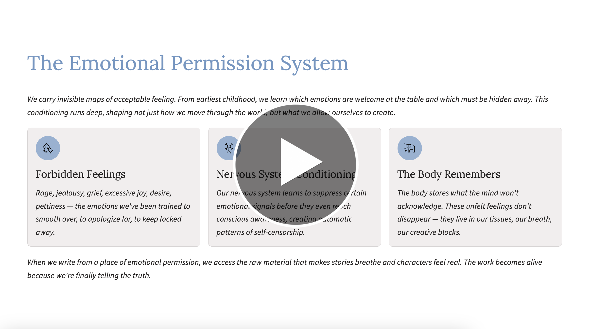 If you joined us Sunday for our free Impermissible Emotions class, we explored how the feelings we've been trained to smooth over—rage, jealousy, grief, excessive joy, desire, pettiness—don't just disappear. They show up as flat characters, hollow grief scenes, and celebrations that don't land. When we can't feel it in life, we can't write it authentically. We mapped the emotions we've labeled "too much" and traced where those same feelings go missing in our creative work.